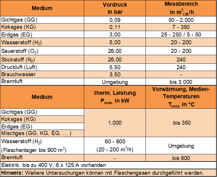 Angaben zu Gasen und Medien am Hochtemperaturtechnikum