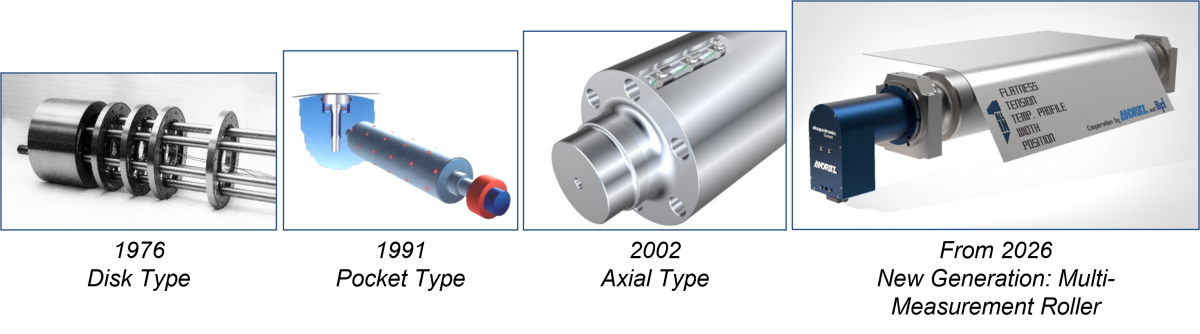 The development of the BFI flatness measuring roller includes several important milestones. It all began in 1976 with the disc type, which was the first generation to bring fundamental BFI flatness measuring technology to rolling mills. This was followed in 1991 by the pocket type, which set new standards with its high sensitivity. In 2002, the axial type was introduced, which, in addition to its high sensitivity, has a closed roller surface that ensures that no marks are left on the metal strip. The latest generation, the multi-measuring type, will be available from 2026. In addition to high sensitivity and a closed roller surface, it not only enables flatness measurement, but also the monitoring of other key process parameters, such as strip edge detection.