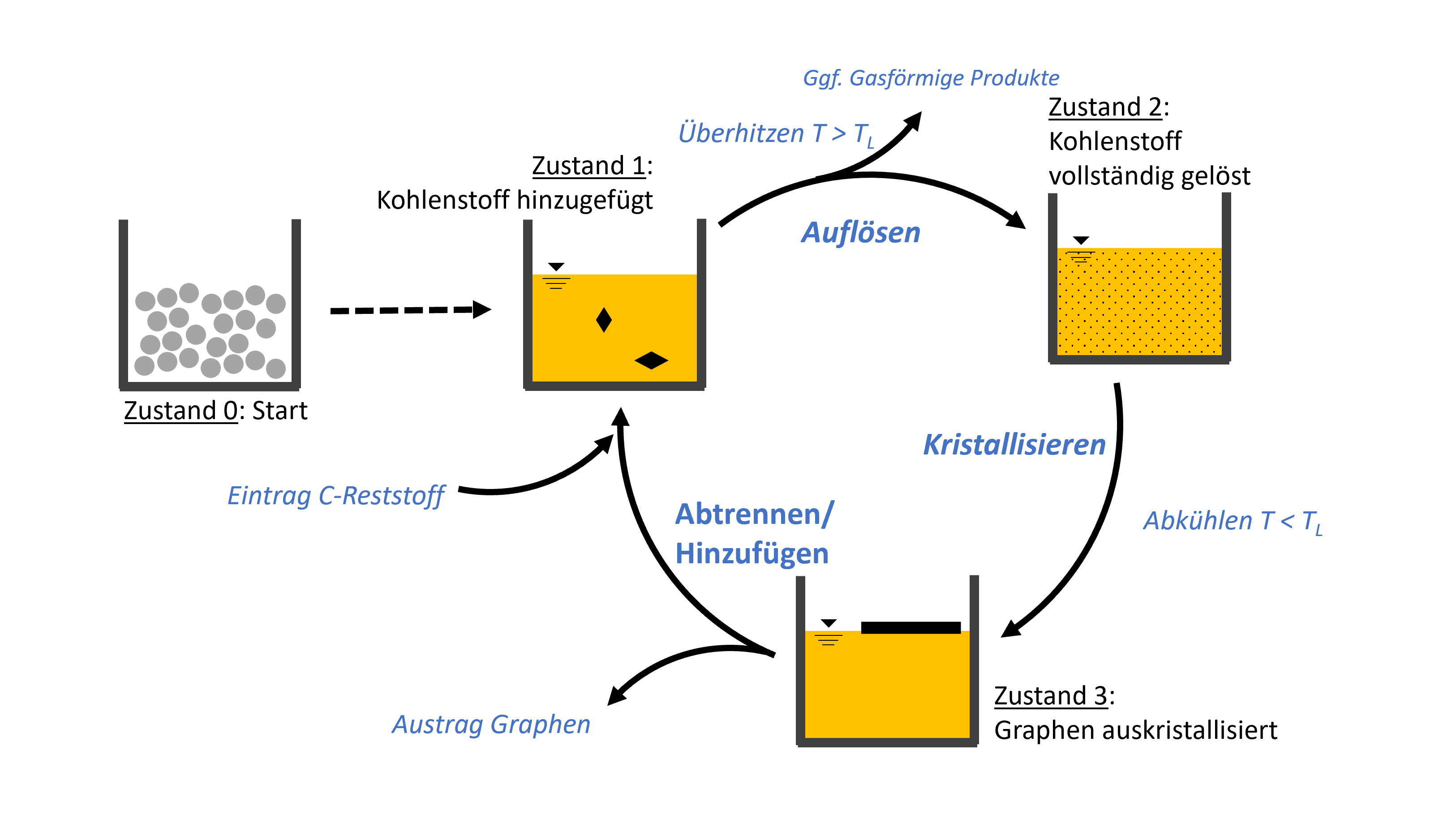 Die Schmelzrekristallisation basiert auf dem Auflösen von Kohlenstoff in geschmolzenem Metall, um die ursprüngliche Struktur des Kohlenstoffs aufzubrechen und neue Graphitkristalle zu bilden. Um GNP herzustellen, muss das Kristallwachstum der gebildeten Graphene zum richtigen Zeitpunkt eingeschränkt werden. Dazu wird die Schmelze durchgast und die gebildeten GNP können anschließend aus dem Gasstrom gefiltert werden. Zur erfolgreichen Umsetzung müssen Temperatur und Durchgasung der Schmelze genau geregelt werden. Daher wird im Forschungsvorhaben eine optimierte Anlagentechnik in Form einer Miniplant für die Schmelzrekristallisation entwickelt.