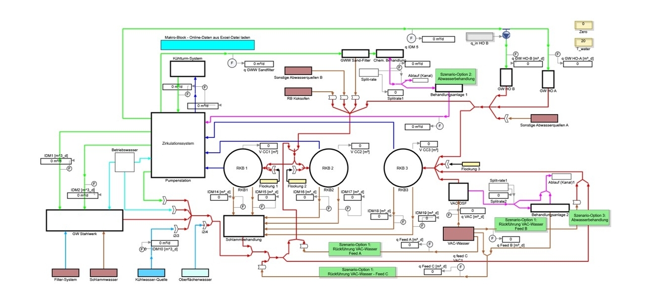 Furthermore, the BFI uses the commercial software tool SIMBA#® for modelling and simulation of issues in cooling and process water cycles in various funded R&D projects (WEISS4PN, IndiWater, CORNERSTONE, DynaWater4.0) and bilateral projects. The digital mapping of process water cycles enables forecasts to be made regarding process water, chemical, and energy requirements, process and resource optimization, the avoidance of downtime and bottlenecks, optimal planning of maintenance measures, and the digital testing of new process water treatment plants prior to operational implementation.
