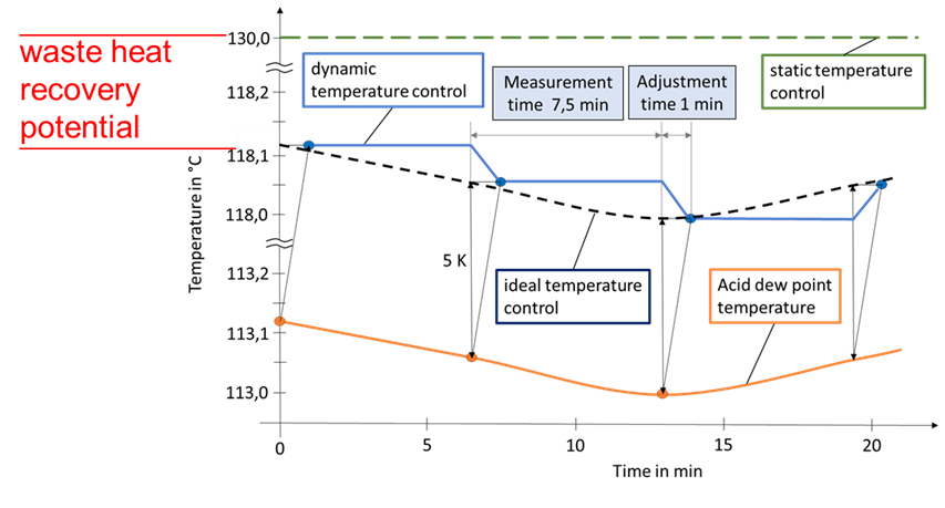 The acid dew point temperature fluctuates greatly during the combustion of steel mill gases. To prevent corrosion damage, the exhaust gas temperature is usually set 10–20 K above the calculated maximum acid dew point temperature (ADP). This, however, causes energy losses at lower ADP temperatures. The RFCS project SafeDewPoint demonstrated that up to 20% of waste heat can be recovered by dynamically adjusting the exhaust gas temperature. A novel inline acid dew point sensor was developed and successfully tested for this purpose.