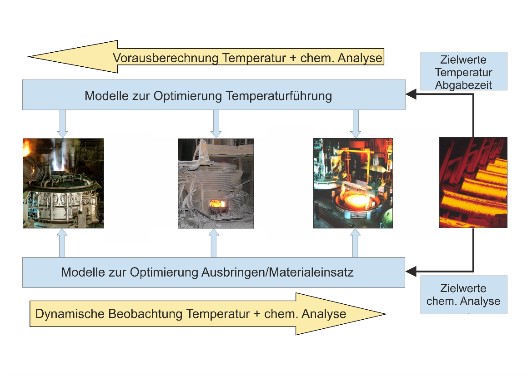 Solutions for the comprehensive automation of process chains are realised on the basis of suitable information flows between systems in a longer process chain. Examples include process control in a steelworks from the tapping of a melt at the electric arc furnace or converter to its casting in the continuous casting plant (TotOptLiS), the prediction of the hydrogen content curve in liquid steel production (HydroPick) or the cross-process-stage equalisation of tensile strength and yield strength over the strip length (StrengthControl). The analytical process models used can be adapted to changing process conditions on a self-learning basis using modern algorithms (PerMonLiSt).