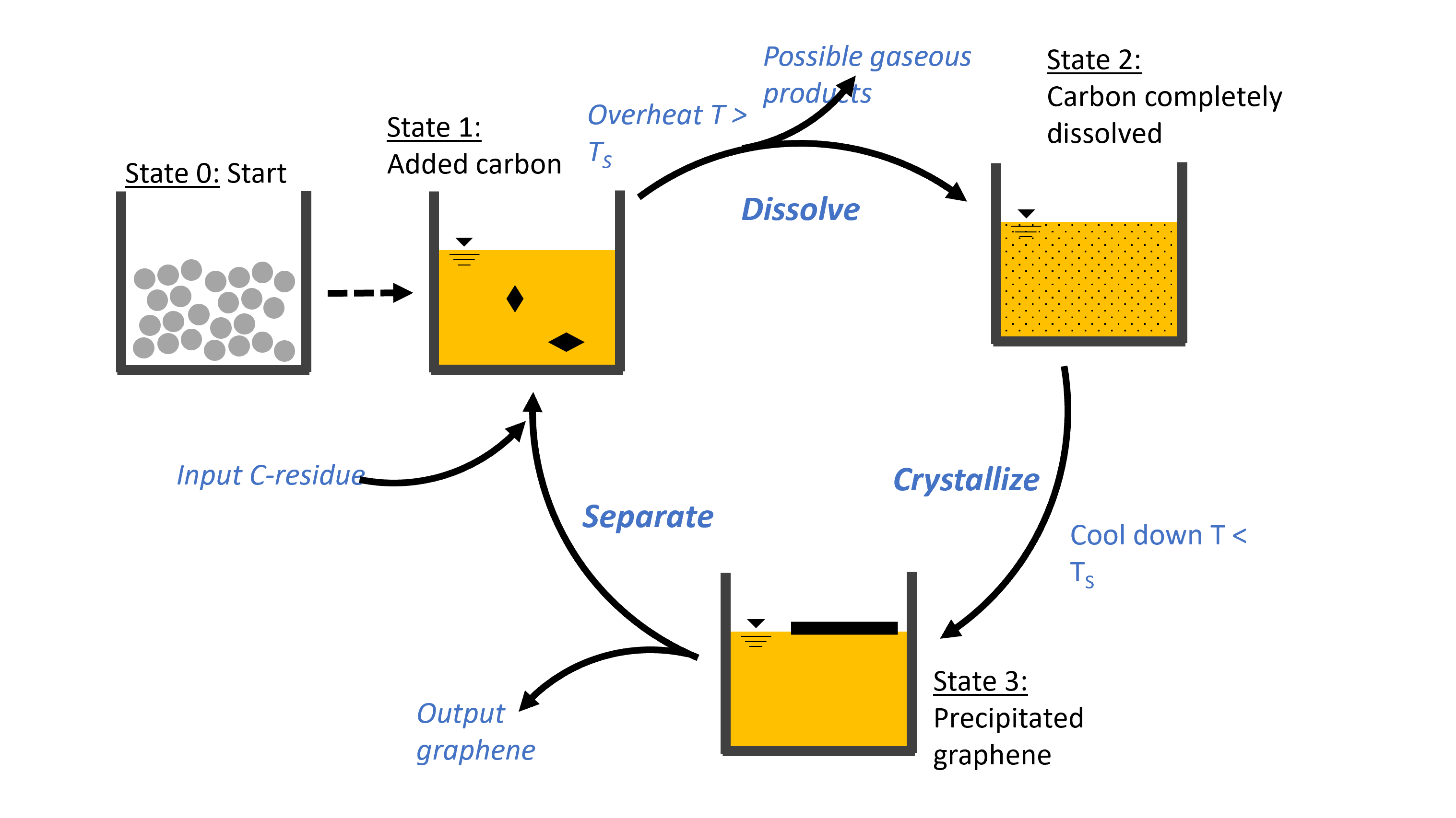 The European Community is required by the European Commission's Circular Economy Action Plan to develop sustainable processes. This also applies to methane pyrolysis, which is used for H2 production without the direct generation of CO2, provided that the energy required for this comes from renewable sources. The same applies to the pyrolysis of plastics in plastic recycling processes, where monomers of the polymer used can be recovered. No utilisation in the sense of the circular economy has yet been established for the solid carbon product formed in both processes. However, these can be recycled in the melt recrystallisation process developed in RekCarb. Building on the positive results of the predecessor project ‘RekCarb’, in which the recrystallisation of amorphous to highly ordered graphitic carbon was successfully implemented, the technical development of melt recrystallisation is being driven forward.