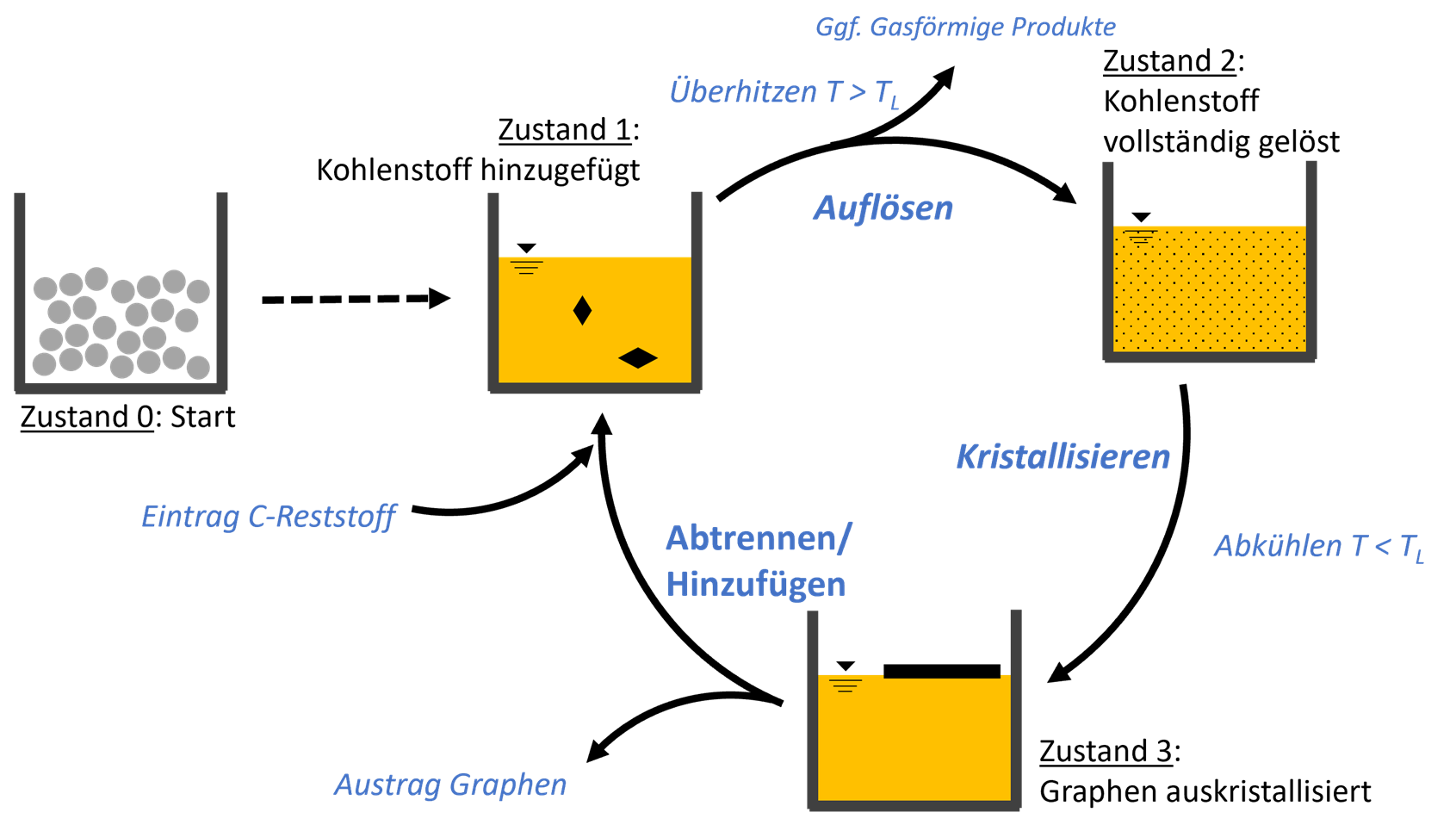 Daneben entwickelt das BFI aktuell im Technikumsmaßstab die Aufwertung von kohlenstoffhaltigen Reststoffen durch Rekristallisation aus Metallschmelzen (RekCarb; RekCarb2). Dazu wird in einer Mini-Plant die Schmelzrekristallisation umgesetzt um Graphen-Nano-Platelets (GNP) im kontinuierlichen Betrieb herzustellen. Durch den Einsatz von induktiver Beheizungstechnik (Mittelfrequenz) wird ein kontinuierlich-zyklischer Betrieb ermöglicht. Die Qualität des erzeugten Graphens wird unter anderem mittels Raman-Spektrometrie bewertet. Die Aufstellung einer belastbaren Massen- und Energiebilanz dient als Basis zur Abschätzung von Kosten und Aufwand für den Produktionsbetrieb. Die Anwendung der GNP wird z.B. in Zementmischungen und Leitmitteldispersionen getestet.