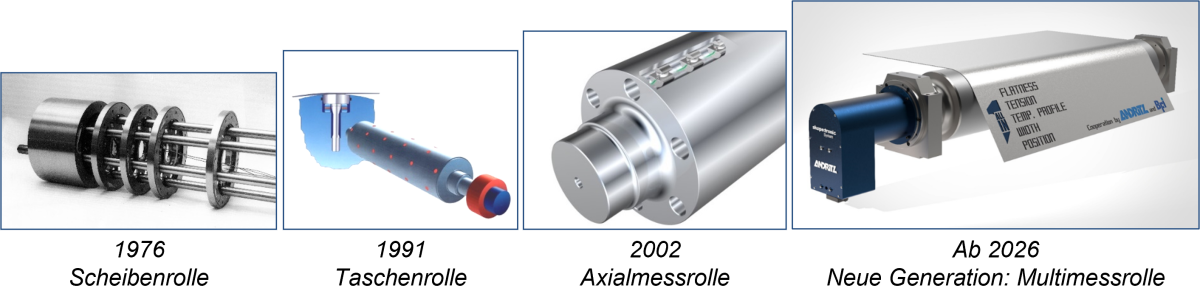 Die Entwicklung der BFI-Planheitsmessrolle umfasst mehrere wichtige Meilensteine. 1976 begann alles mit der Scheibenrolle, die als erste Generation grundlegende BFI-Planheitsmesstechnik in die Walzwerke brachte. 1991 folgte die Taschenrolle, die durch ihre hohe Empfindlichkeit neue Standards setzte. Im Jahr 2002 wurde die Axialmessrolle eingeführt, die zusätzlich zur einer hohen Empfindlichkeit eine geschlossene Rollenoberfläche besitzt, die sicherstellt, dass keine Abdrücke auf dem Metallband entstehen. Die neueste Generation, die Multimessrolle, wird ab 2026 verfügbar sein. Sie erlaubt zusätzlich zu einer hohen Empfindlichkeit und einer geschlossenen Rollenoberfläche nicht nur die Planheitsmessung, sondern auch die Überwachung weiterer wesentlicher Prozessparameter wie die Bandkantenerfassung.