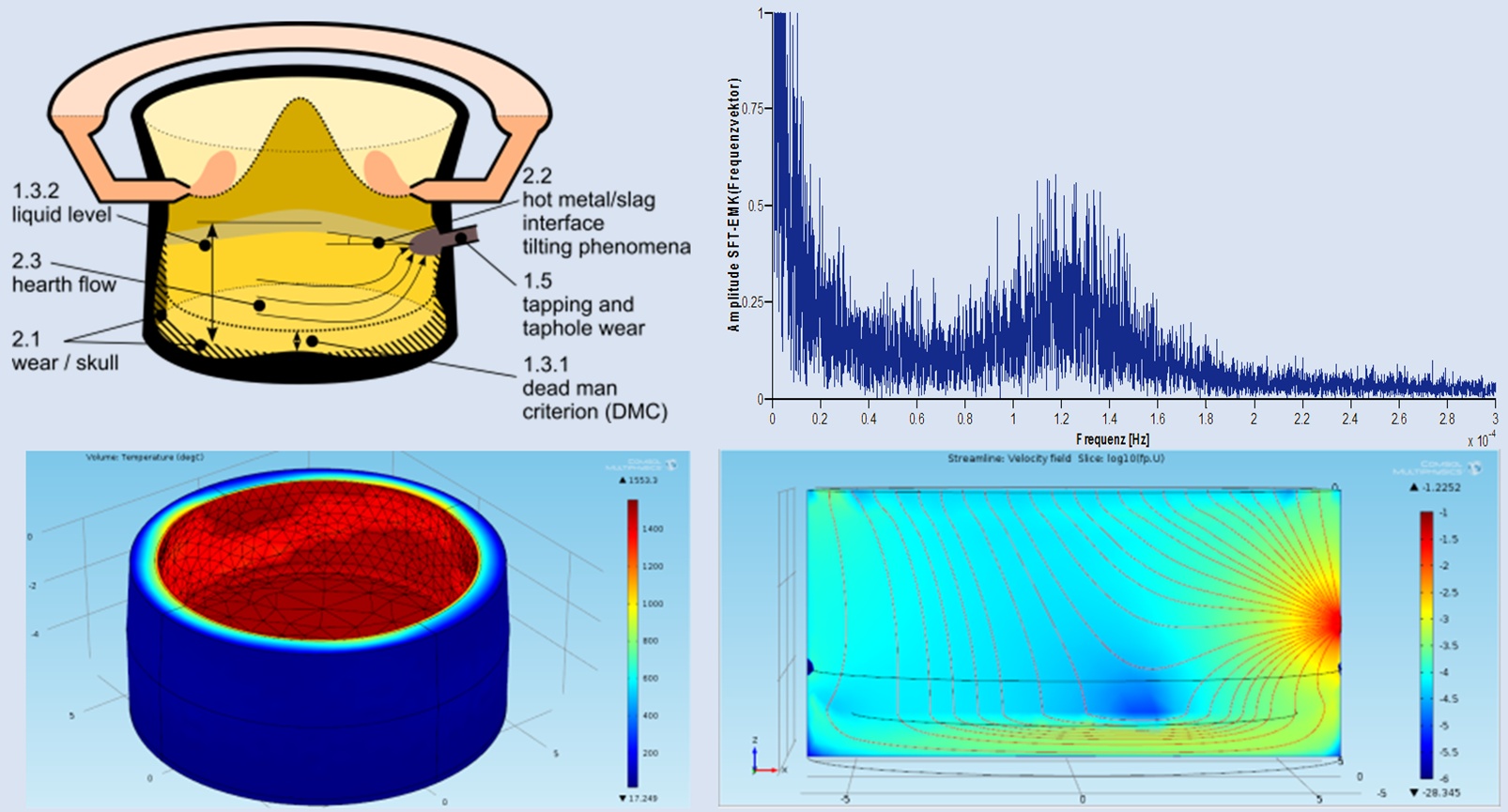 - 3D hearth flow model as well as models of the iron – slag interface tilting and tap hole flow.